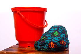 Each Bucket (red or Blue) contains 5 reusable sanitary pads, a small African fabric pull string bag for storage and a piece of washing soap